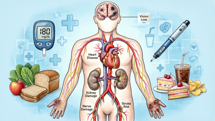 High blood sugar harms organs leading to diabetic complications. These problems can be very serious affecting many parts of the body. Over time, diabetes can damage nerves, leading to neuropathy, increasing the risk of heart disease, stroke, and kidney damage (nephropathy). Eye damage, foot problems are also common due to nerve and blood vessel damage.