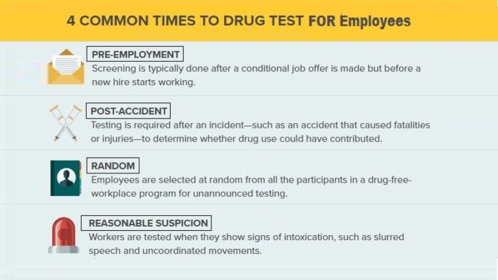 Employers may test job applicants and employees for drug and alcohol use, which is controlled by state law and company policy. Employers should prohibit the use of drugs and alcohol in the workspace. Employees who are engaging in illegal drug use may be fired. Employment drug testing can be at any time: Pre-employment, Randomly, Post-accident, or Suspicion of drug use.