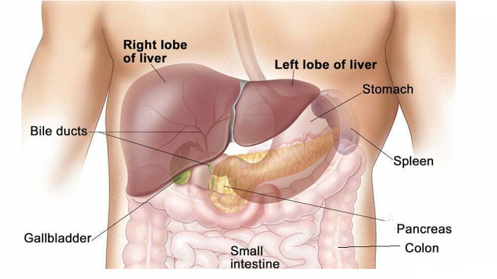 Liver is the largest internal organ in the body. It’s located in the upper right side of the abdomen, beneath the diaphragm, and above the stomach. It’s divided into two main lobes: right and the left. These two lobes are further divided into smaller lobules.