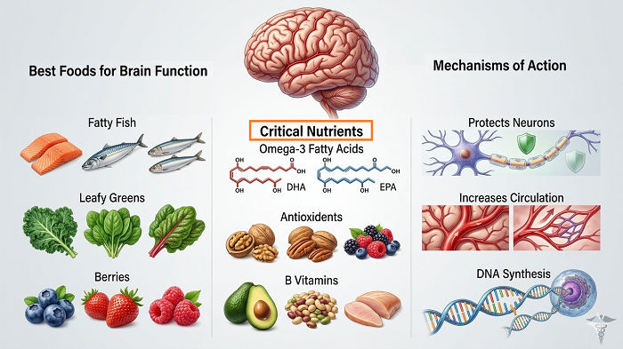 | Omega-3 Fats | Brain cell structure, anti-inflammatory | Salmon, mackerel, sardines, flaxseeds, walnuts |