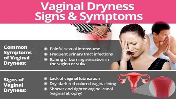 Vaginal dryness, for any reason, can be uncomfortable and very painful during sex. It may lead to itching, burning, and painful intercourse. During vaginal examination the doctor can see signs of vaginal atrophy; shortening of vaginal canal , lack of lubrication inside the vagina and dark red colored lining.